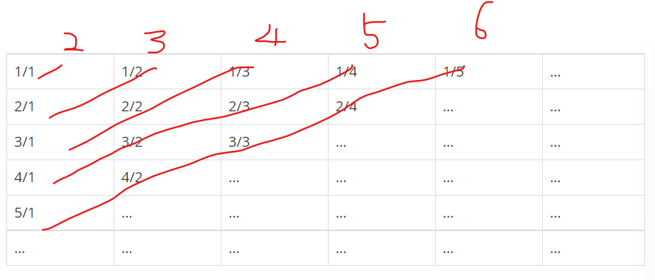 첫번째로, 각 줄의 분자 분모의 합은 줄 번호+1이라는 것